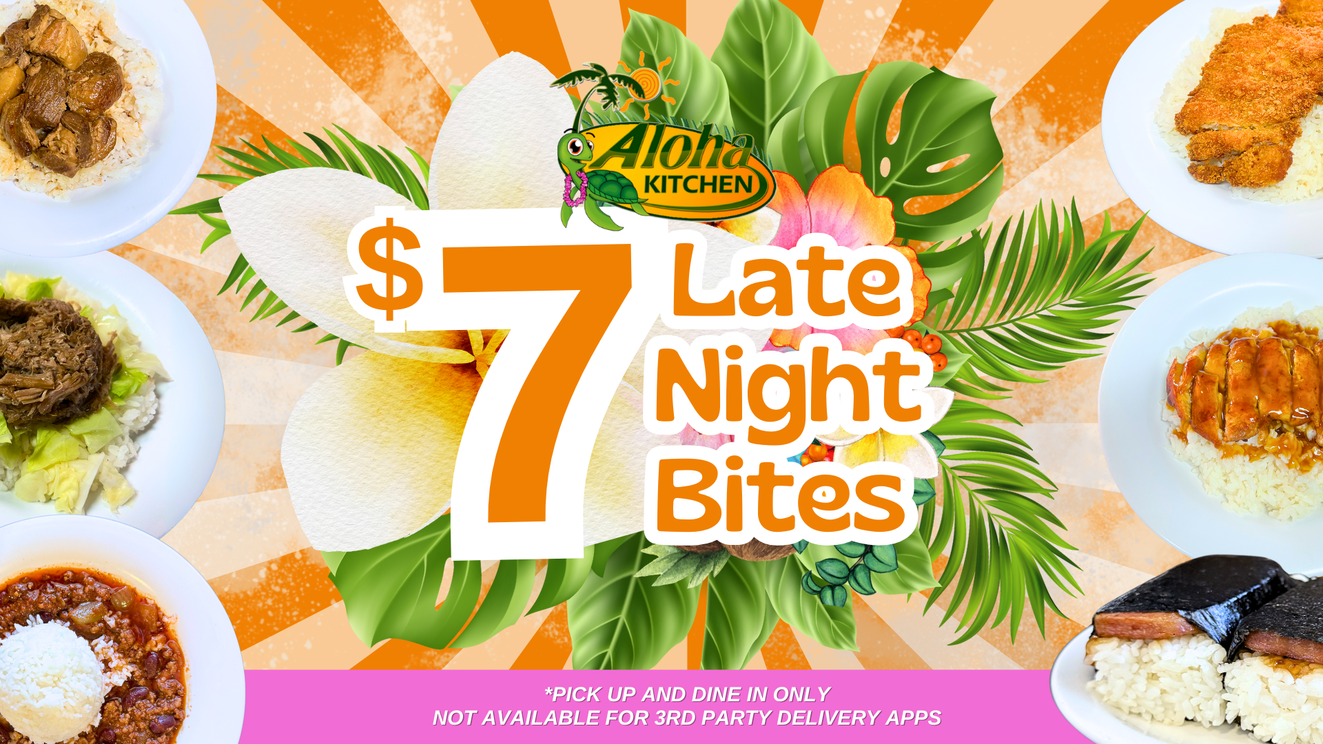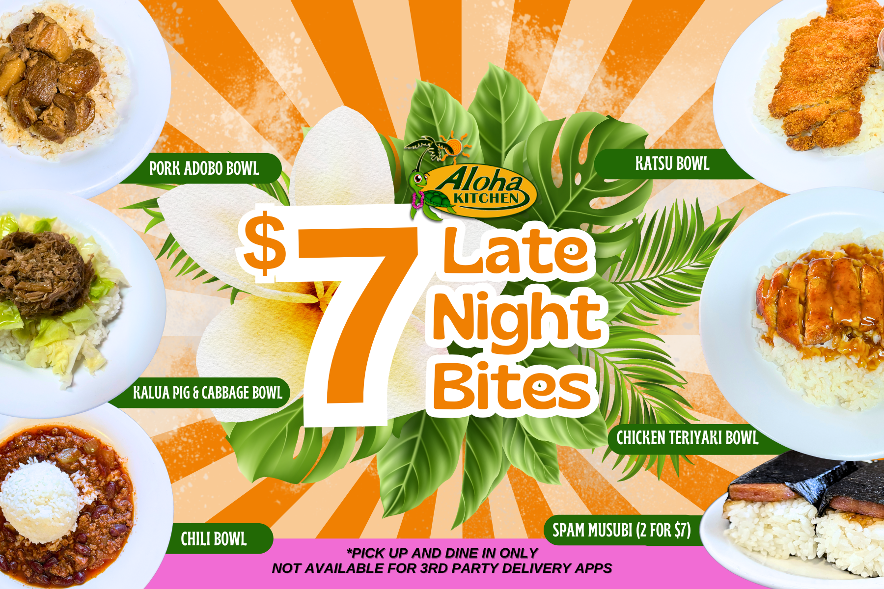 Craving late-night bites? Aloha Kitchen has you covered with our Late Night Combo! Get delicious options for just $7! Perfect for satisfying your hunger after hours. Hurry in today